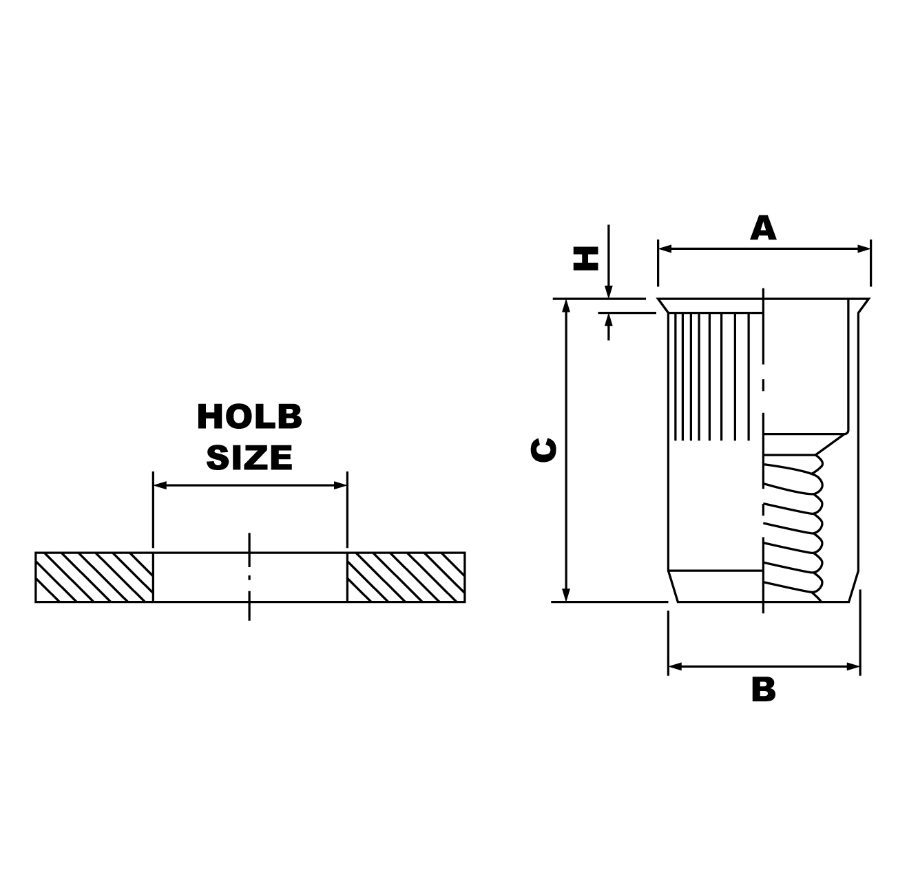 | PART NO. | THREAD SIZE | GRIP RANGE | HOLE SIZE+0.15 | A±0.3 | B max | C±0.38 | H±0.13 |